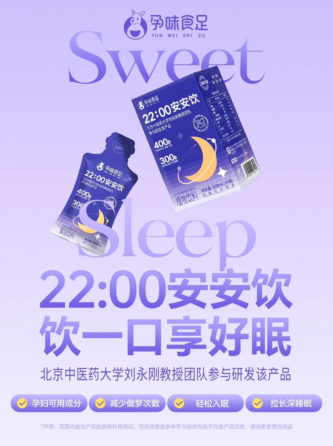 正是洞察到孕晚期睡眠困境的普遍性与健康隐患,同时看到市场供给的空白,孕味食足推出了由北京中医药大学刘永刚教授团队参与研发、专为孕产期妈妈设计的「22:00安安饮」。