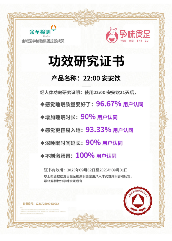 通过构建“权威研发+安全检测+临床有效”三位一体的产品准则,孕味食足「22:00安安饮」不仅重新定义了孕产期助眠产品的标准,也奠定了其作为“孕产期营养助眠饮领创品牌”的行业地位。